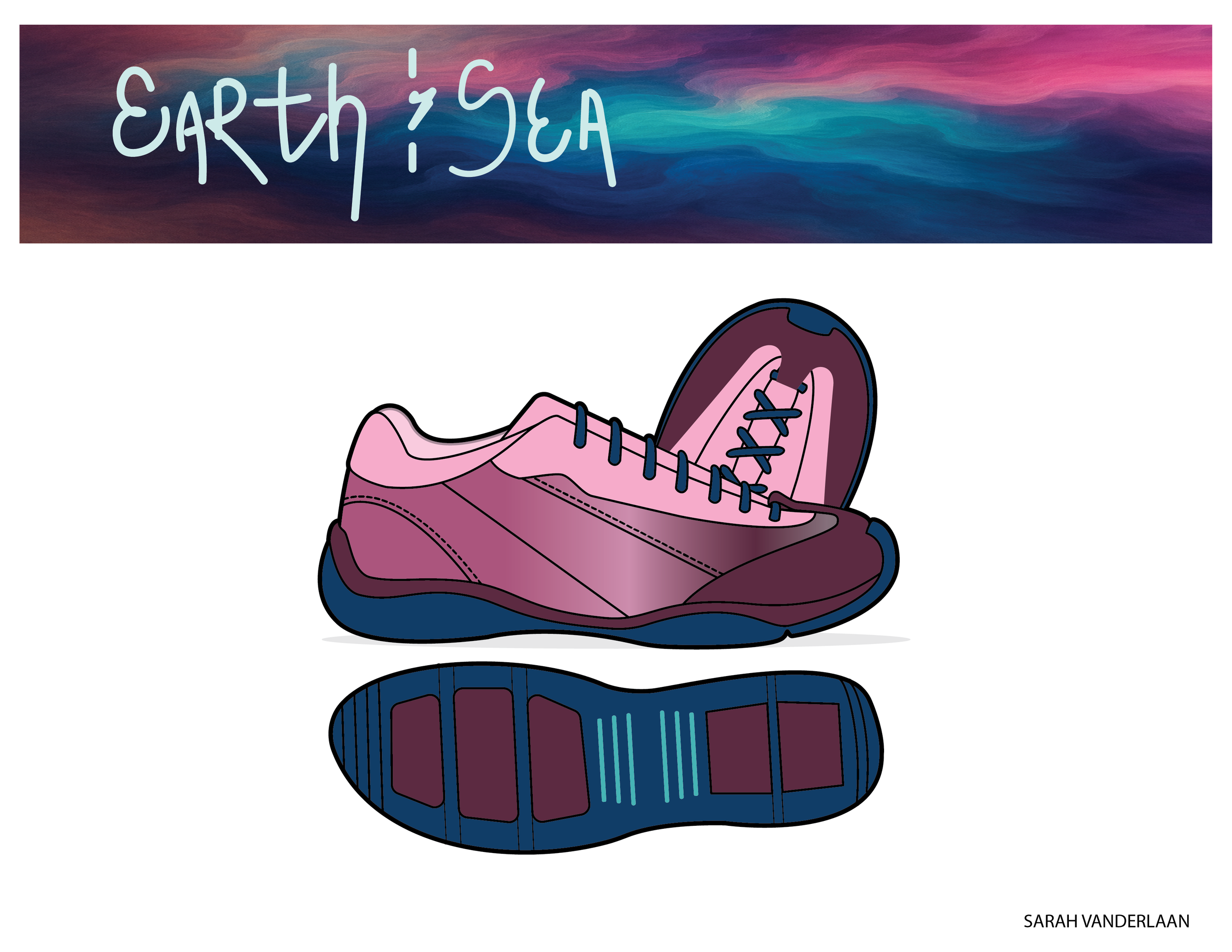 An Earth and Sea shoe that celebrates the deep saturation found in nature. Deep mud red and abyss blue with pinks drawn from the sunset after a summer storm. The shoe was generated using nano-banana